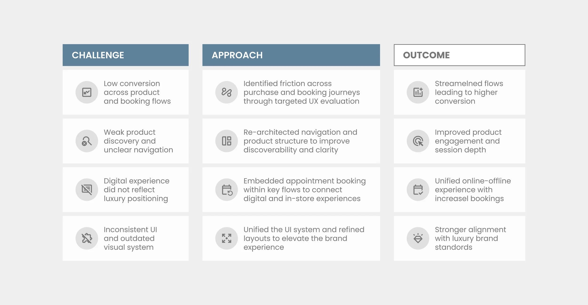 A focused UX evaluation uncovered key friction points across the customer journey, particularly within product discovery, navigation, and booking flows. Each challenge was addressed through targeted design interventions, from restructuring navigation and embedding appointment booking into core flows to establishing a cohesive UI system, resulting in a more intuitive, premium experience that improved usability and supported conversion